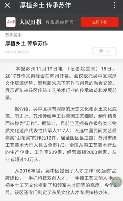 2016年起,吴中区提出了人才工作“双面绣”品牌建设,一手抓科技双创人才,一手抓工艺文创人才,把乡土工艺文化提到了和领军人才同等的高度。今年2月,该区还专门制定了东吴文化人才专项扶持办法。(20171120日《人民日报》第6版)