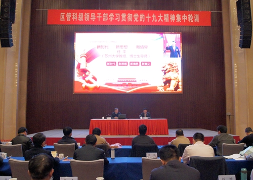 党的十九大胜利召开后,吴中区坚持领导带头、精心组织、狠抓落实,迅速掀起学习贯彻十九大精神的热潮。11月22日起,分4批开展区管科级领导干部学习贯彻党的十九大精神集中轮训。市委宣讲团成员、区委书记唐晓东在第一期轮训班上进行了集中宣讲。